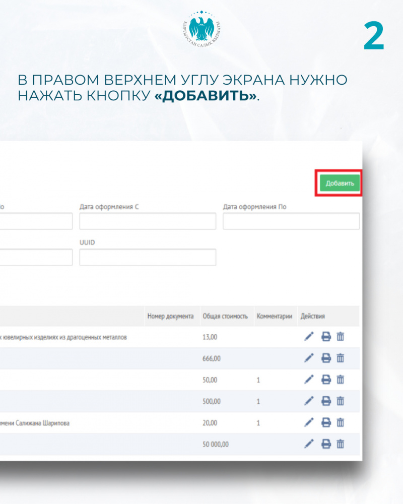 • В правом верхнем углу экрана нужно нажать кнопку "Добавить". В открывшемся окне требуется установить отметку в поле "Внесение сведений о драгоценных ювелирных изделиях из драгоценных металлов".