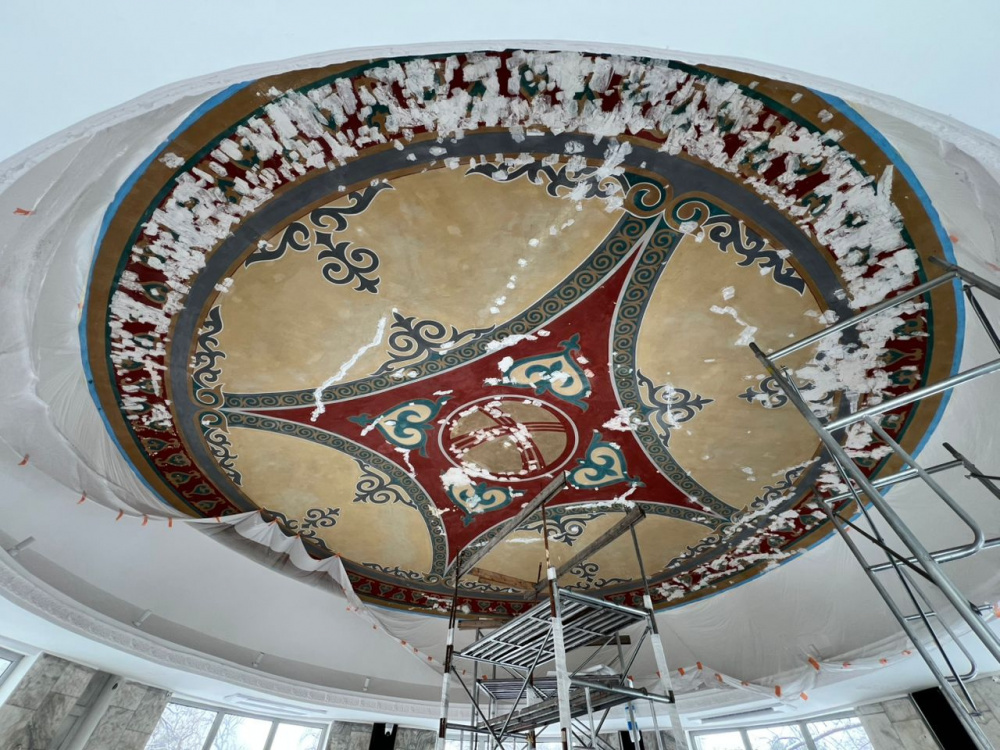 Для художников было важно сохранить не только рисунок, но и само настроение этого места. "Все цвета здесь приглушенные, они не яркие и не кричащие. Это не про попытку сделать "дорого-богато", а про спокойствие и атмосферу. Я всех, кто сюда заходит, спрашиваю: "Как вам? Спокойно?" И все отвечают: да, спокойно. Традиционные кыргызские орнаменты, плавные переходы цвета и знаменитая скульптура Ольги Мануйловой "Девушка с фруктами", которая стоит в центре ротонды, создают здесь какую-то особую ауру", - отмечает Валерий.