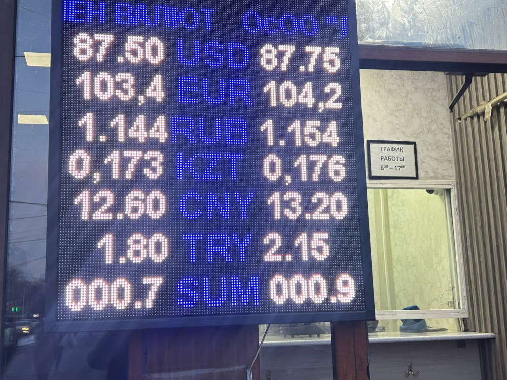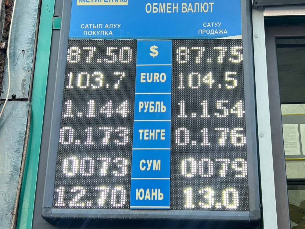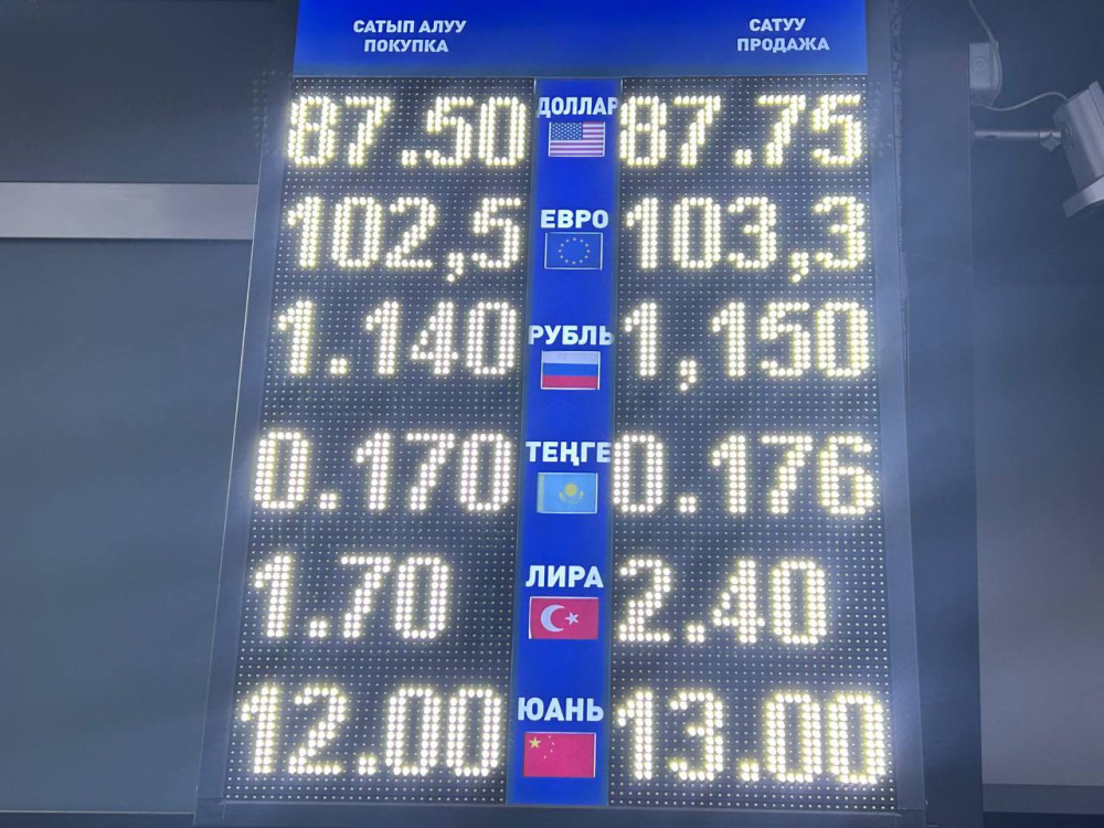 Курс доллара вырос, и теперь при покупке он стоит 87,5 сома, при продаже - 87,75.