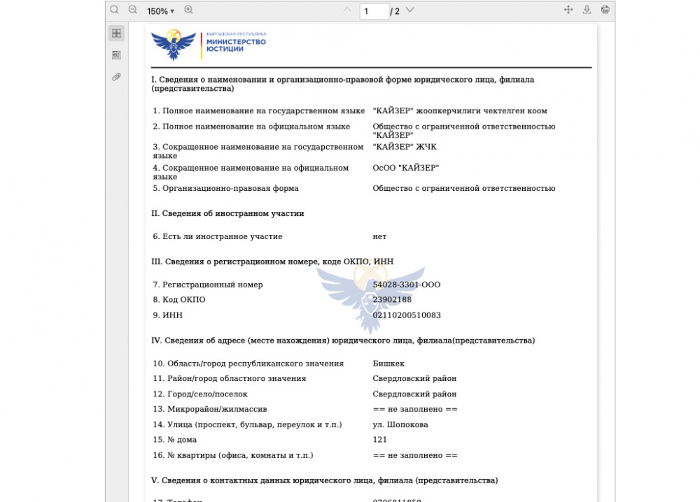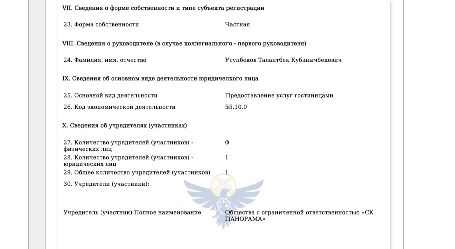Согласно данным Минюста КР, ОсОО "Кайзер" занимается предоставлением услуг гостиниц. Директором значится Усупбеков Талантбек Кубанычбекович, а учредителем ОсОО является ОсОО "СК "ПАНОРАМА".