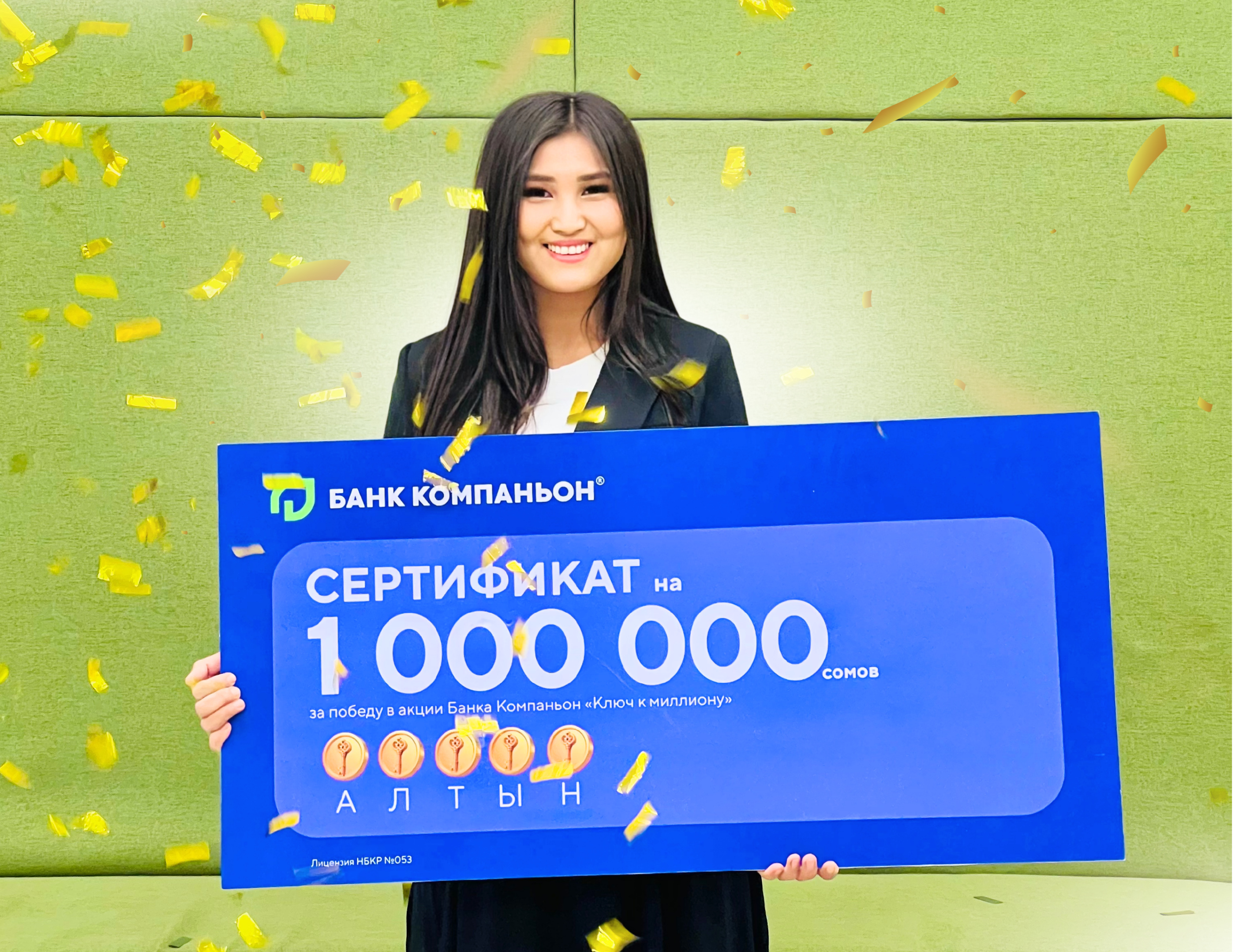 Банк Компаньон продолжает радовать клиентов крупными денежными призами. В рамках акции "Ключ к миллиону" золотой сундук с главным призом в 1 000 000 сомов открыла пользователь приложения "Компаньон" Киргилова Жазгүл Асанкуловна, став одной из счастливых победителей.