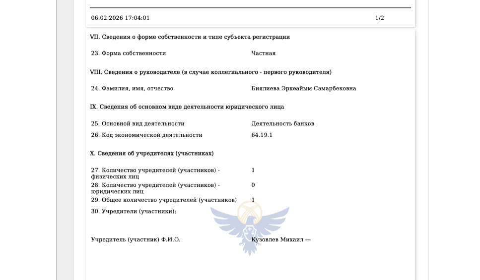 Единственного учредителя компании Михаила Кузовлева открытые источники связывают с российским финансовым сектором (экс-глава "Банка Москвы"). На пост председателя правления нового банка ранее был назначен Эркинбек Жумабаев, возглавлявший "Керемет Банк" и "Банк Компаньон". Но на данный момент в качестве руководителя указана Биялиева Эркеайым Самарбековна.