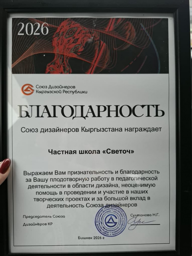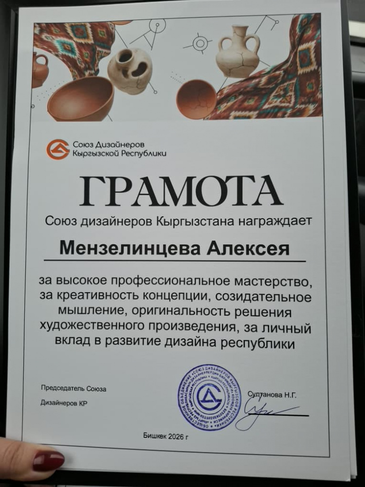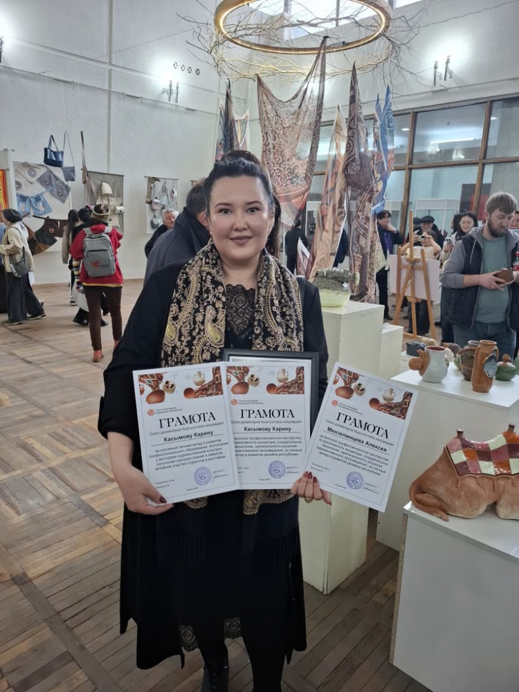 В ходе торжественного открытия выставки Алексей Мензелинцев и Карина Касымова награждены грамотами Союза дизайнеров Кыргызстана, школа "Светоч плюс" - благодарственным письмом.