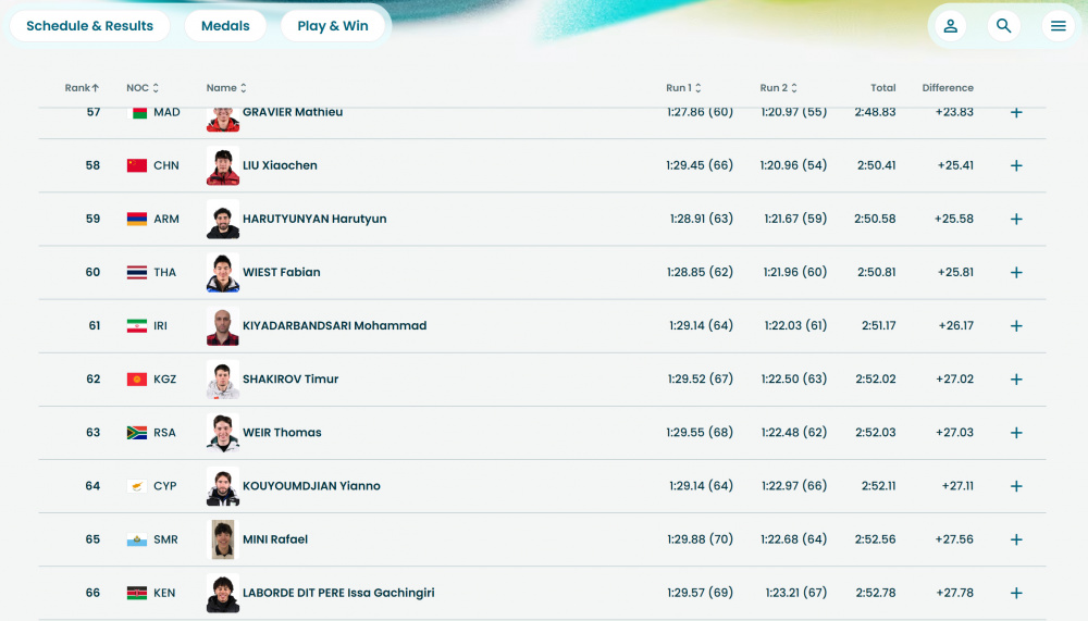 Во второй попытке кыргызстанец финишировал с результатом 1 минута 22,5 секунды и занял 63-е место. Его отставание от лидера составило 11,42 секунды.