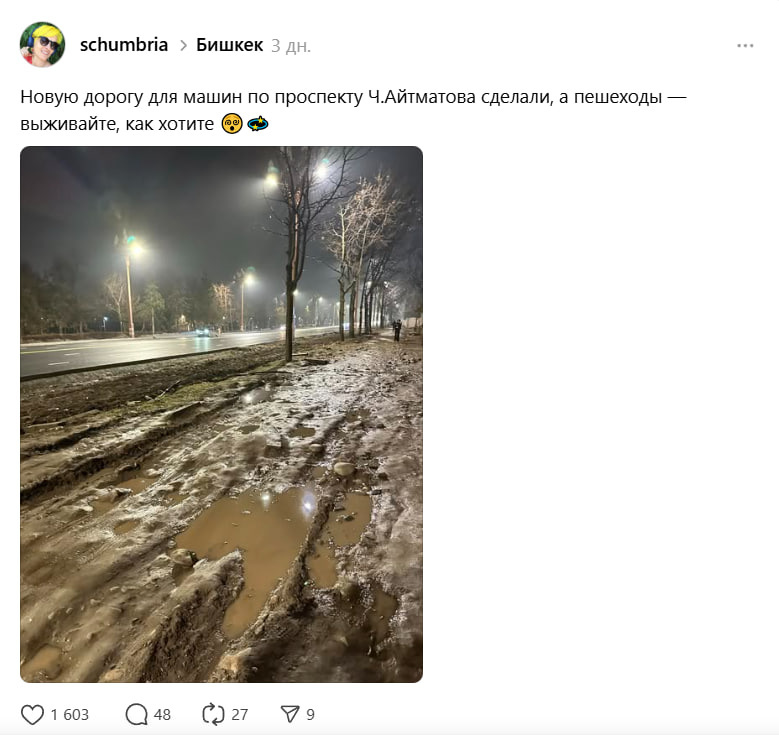 Жители близлежащих домов по пр. Айтматова жалуются, что от ул. М. Гшлиессера до пр. А. Масалиева за недавно построенным подземным пешеходным переходом (со стороны посольства Казахстана) не благоустроили тротуары.