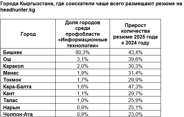 По итогам 2025 года соискательская активность в сфере IT на headhunter.kg остается сосредоточенной в Бишкеке (доля 80,3%; +43,4%), который аккумулирует основную часть резюме в профобласти. При этом более высокая динамика прироста наблюдается в регионах - Кара-Балта (1,6%; +47,3%) и Ош (3,1%; +39,6%), а также в Манасе (1,9%; +31,4%) и Караколе (2,0%; +30,3%). Умеренный рост фиксируется в Токмоке (1,7%; +29,9%), Канте (1,1%; +29,7%) и Таласе (1,0%; +25,9%). В целом структура остается централизованной, однако региональные города постепенно увеличивают вклад в общий объем предложения IT-специалистов.
