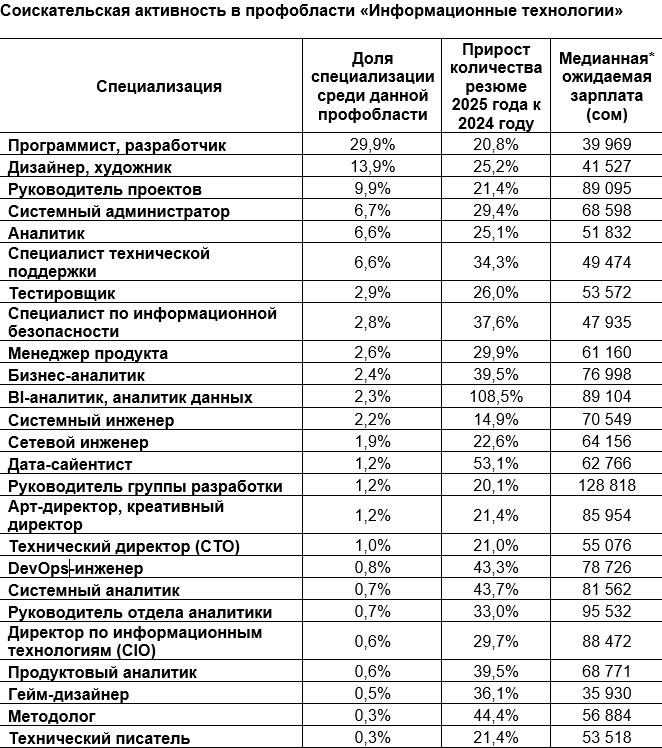 По итогам 2025 года в сфере IT на headhunter.kg наибольшую долю среди резюме сохраняют программист, разработчик (доля 29,9%; прирост +20,8%; медианная зарплата 39 969 сомов), дизайнер, художник (13,9%; +25,2%; 41 527 сомов) и руководитель проектов (9,9%; +21,4%; 89 095 сомов).