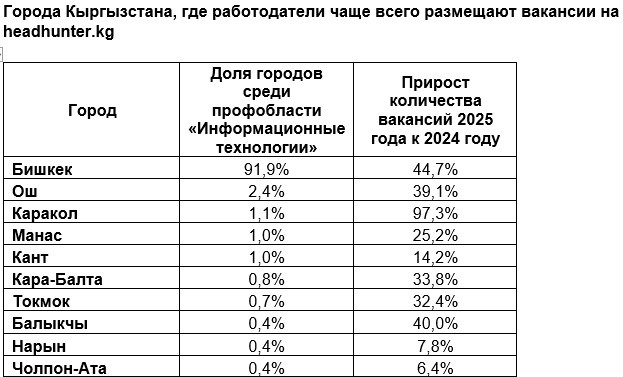 По итогам 2025 года работодательская активность в сфере IT на headhunter.kg практически полностью сосредоточена в Бишкеке (доля 91,9%; прирост +44,7%), который формирует основную часть вакансий в профобласти. При этом наиболее высокие темпы роста демонстрируют регионы: Кант (1,0%; +14,2%), Токмок (0,7%; +32,4%) и Каракол (1,1%; +97,3%). Умеренная положительная динамика наблюдается в Оше (2,4%; +39,1%), Кара-Балте (0,8%; +33,8%) и Манасе (1,0%; +25,2%). В целом структура остается высокоцентрализованной, однако региональные рынки постепенно усиливают свое присутствие в IT-сегменте.