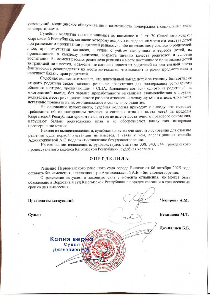 Судебная коллегия Бишкекского городского суда среди прочего отмечает, что "длительный выезд детей за границу без согласия второго родителя может создать реальные препятствия для поддержания регулярного общения с отцом, проживающим в США". "Замещение согласия одного из родителей на многолетний выезд, без заранее проработанного механизма взаимодействия с другим родителем, несет риск фактического разрыва отношений между детьми и отцом, что может негативно повлиять на их эмоциональное и социальное развитие", - говорится в определении.