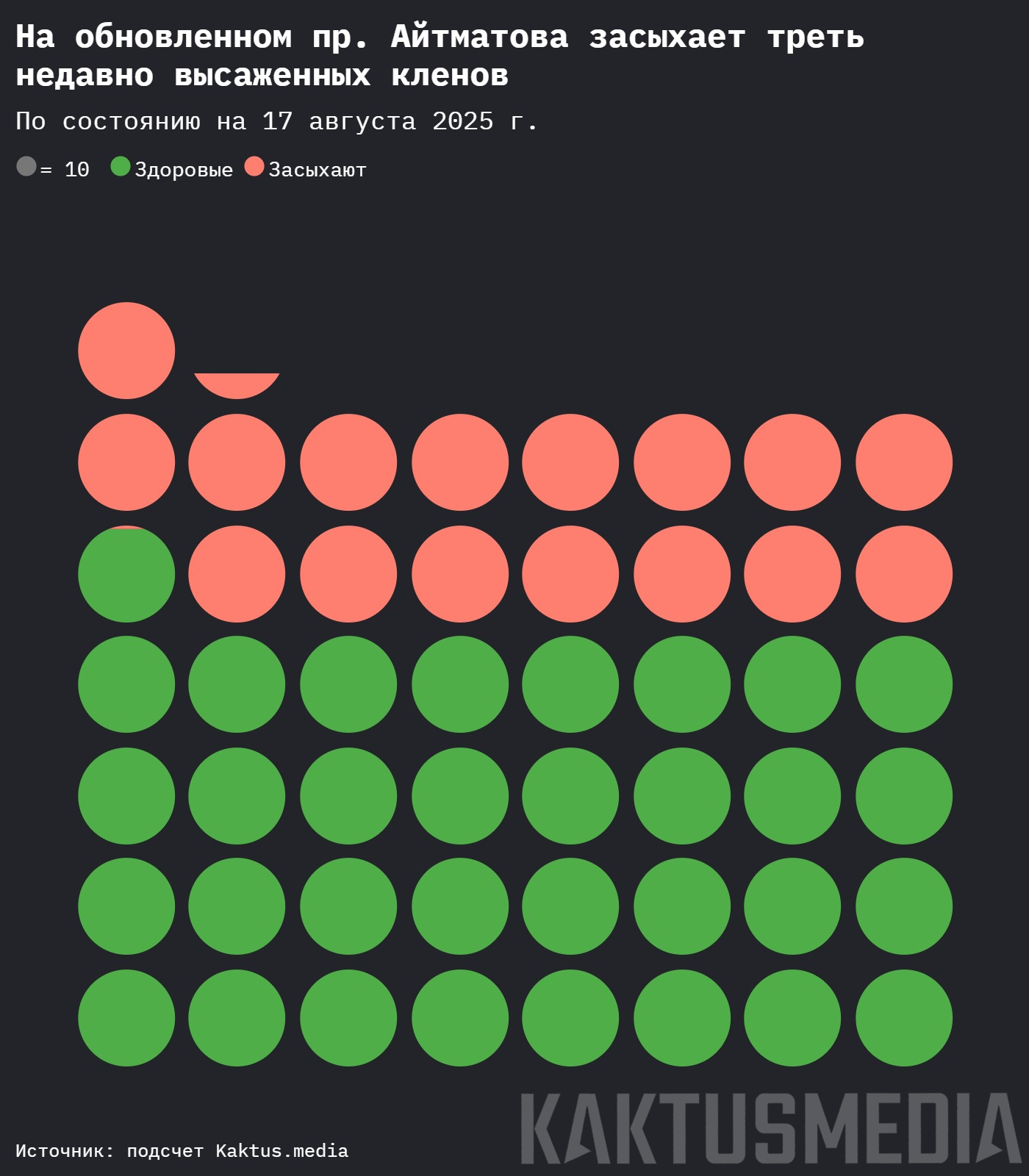 Пока же значительная часть высаженных деревьев не приживается. При этом власти не могут сказать точно, сколько саженцев не прижилось. Агроном муниципального предприятия Жаныбек Жумалиев.пытался объяснить, что для оценки того, сколько приживется деревьев, должен пройти год.
