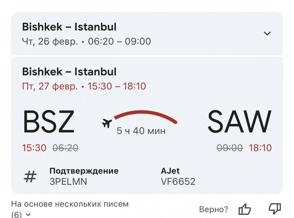 Сегодня, 26 февраля, турецкий лоукостер Аjet отменил рейс VF280 Бишкек - Стамбул в 06:20 и не сообщил об этом пассажирам. Один из них поделился информацией в социальных сетях.