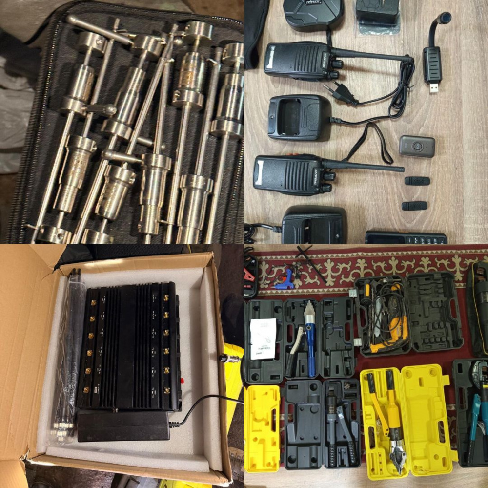 В ходе обысков у задержанных обнаружили оборудование для вскрытия сейфов и дверей, а также подбора ключей различной сложности; радиостанции; GPS-трекеры для слежения за объектами; устройства подавления сигналов охранных систем и сигнализаций.
