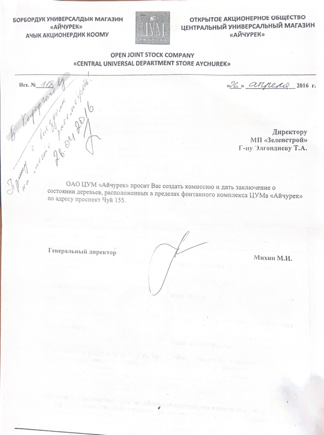 В качестве подтверждения ЦУМ показал письмо от компании Old Bishkek, где они просят рассмотреть возможность о передачи право временного
