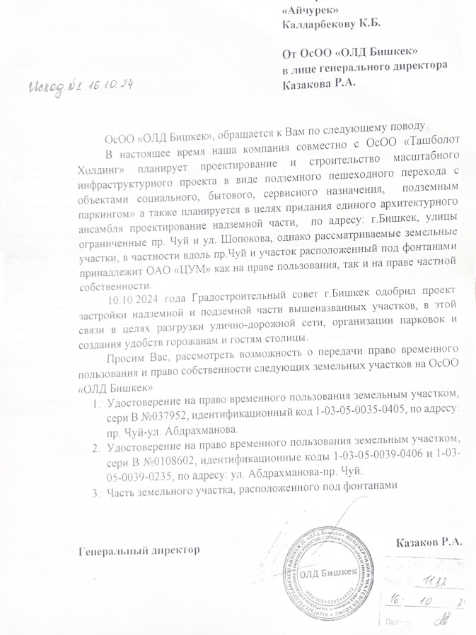"Мы также претендовали на застройку, но наше предложение не выиграло и мы на этом этапе перестали претендовать на что-либо. Но 16 октября 2024 года нами было получено письмо от гендиректора проекта "Old Bishkek, в котором сообщалось, что 10 октября 2024 года градостроительный совет города Бишкек одобрил проект застройки "Old Bishkek, реализуемый совместно с ОсОО "Ташолот Холдинг". В рамках проекта предусмотрено строительство масштабного инфраструктурного объекта - подземного пешеходного перехода и подземного паркинга, а также формирование единого архитектурного ансамбля. В этой связи было предложено передать соответствующие земельные участки для реализации утвержденного проекта", - рассказал она.