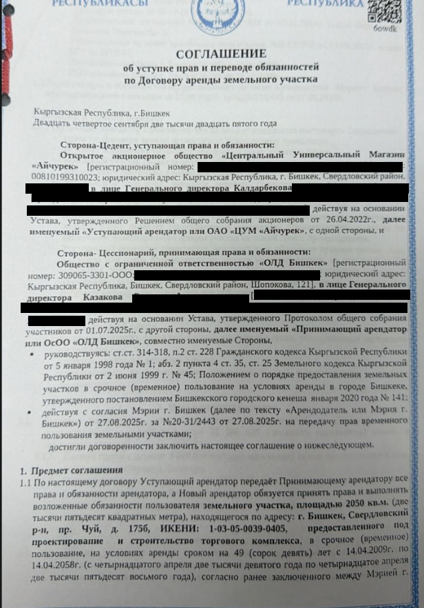 - 24 сентября 2025 года на основании соглашения об уступке прав и переводе обязанностей по договору аренды земельного участка участок под клумбами перешел к ОсОО Old Bishkek;