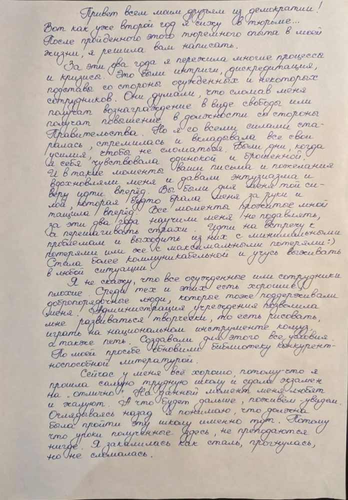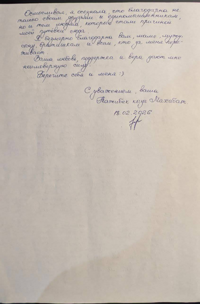 Махабат Тажибек кызы, которая отбывает свой срок, написала письмо общественности. Письмо датировано 18 февраля 2026 года. Вчера, 4 марта, адвокат Асель Аргымбаева посетила Тажибек кызы, а затем опубликовала это письмо с разрешения самой Махабат.