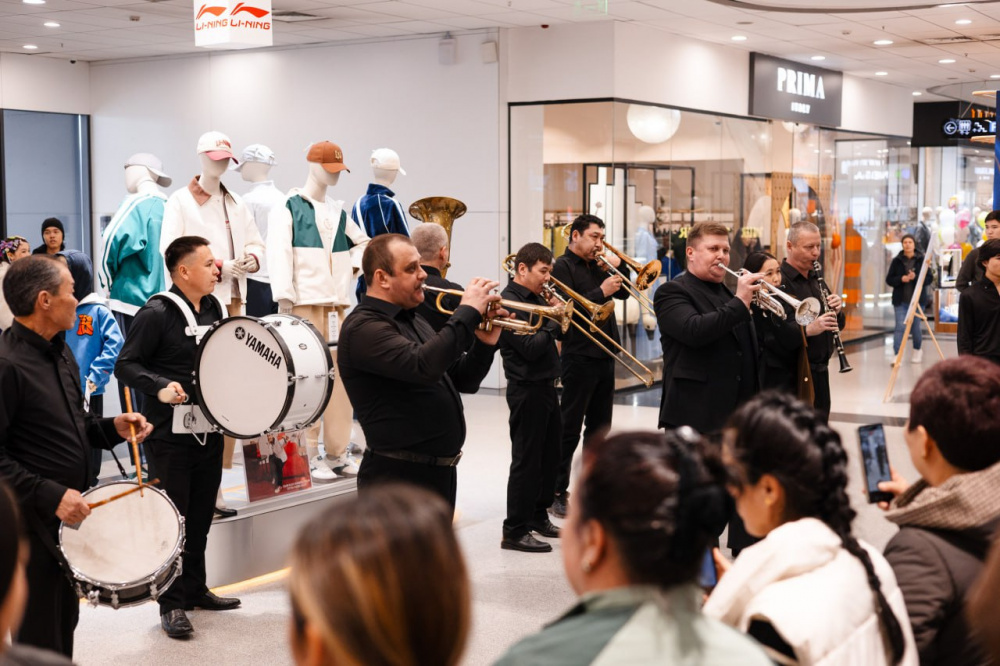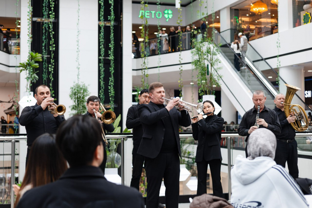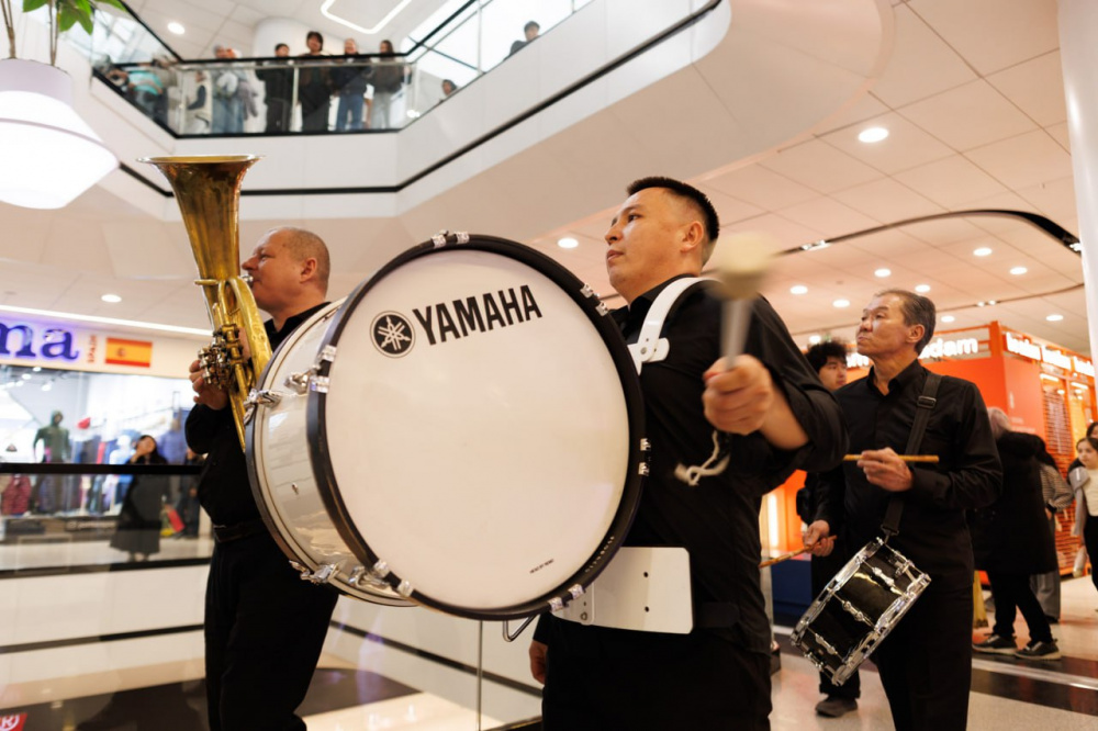 Праздничное настроение царило на всех этажах торгового центра. Духовой оркестр прошёлся по галереям с первого по третий этаж, наполняя пространство живой музыкой и даря улыбки посетителям. В это время аниматоры поздравляли гостей и вручали женщинам букеты цветов, создавая атмосферу настоящего весеннего праздника.