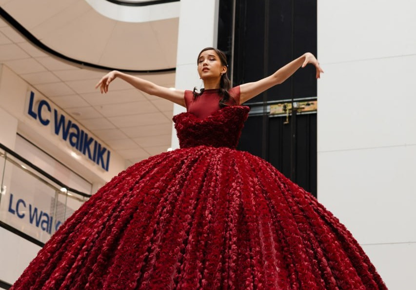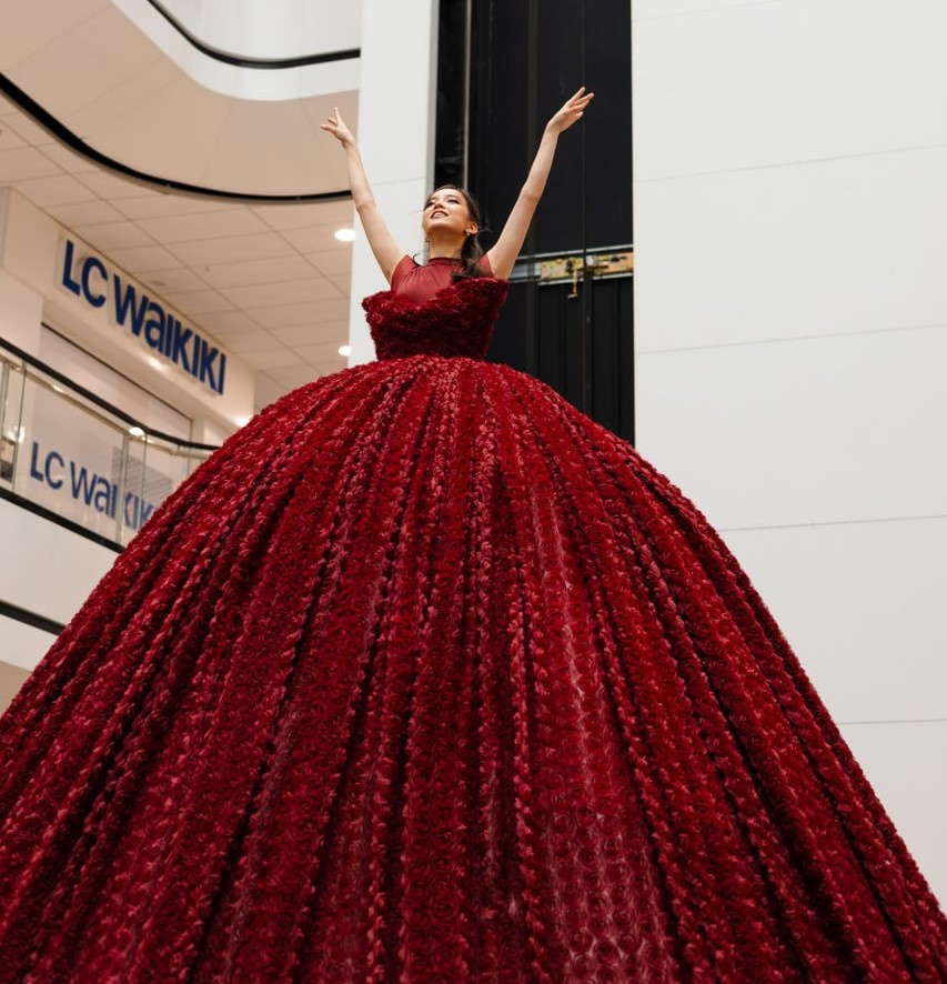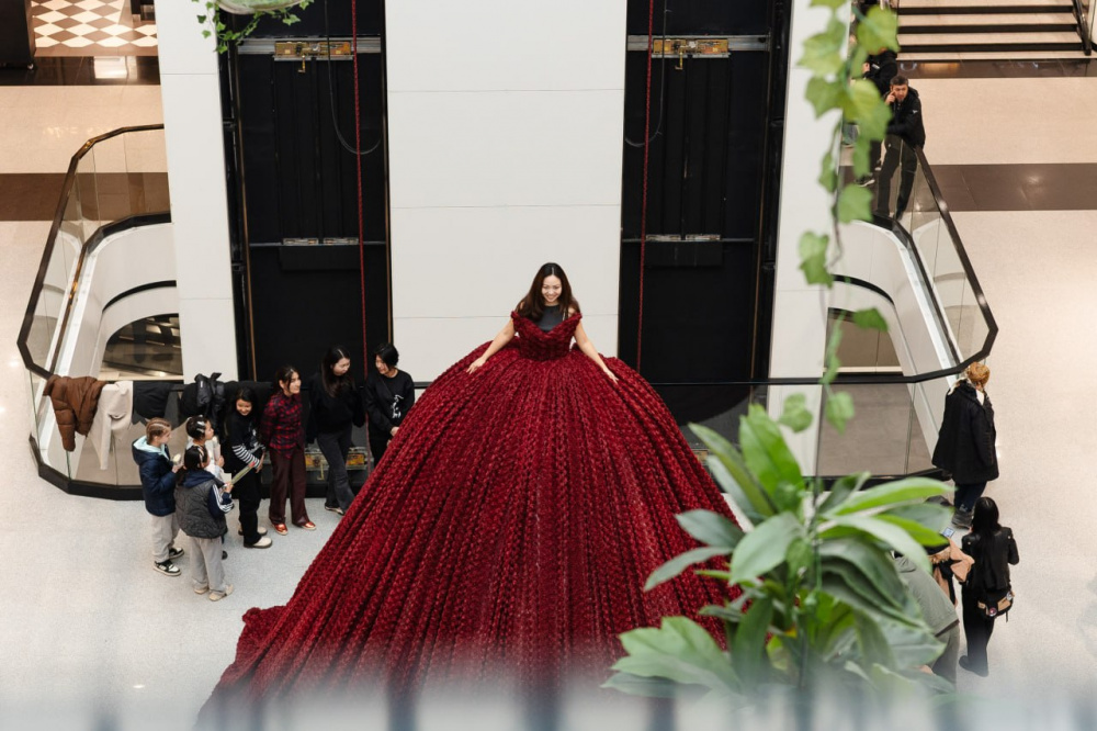 Главным арт-объектом праздника стала 4-метровая фотозона в виде роскошного платья, созданного из великолепного букета роз. Инсталляция стала настоящим украшением пространства торгового центра: каждый посетитель мог подняться на подиум и сделать необычные фотографии, почувствовав себя частью художественного перформанса.
