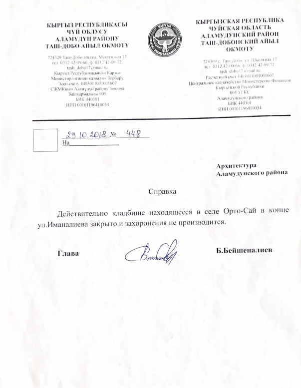 Что касается закрытия кладбища, то, по словам представителя СК "Нурзаман", подтверждение они получили от архитектуры Аламудунского района в 2018 году. И жители села Орто-Сай знают, что кладбище закрыто из-за того, что на нем нет территории для захоронений.