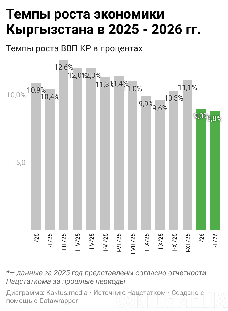 Валовой внутренний продукт Кыргызстана, по предварительной оценке, в январе - феврале текущего года сложился в размере 264,1 млрд сомов и увеличился на 8,8% (относительно января - февраля 2025-го).