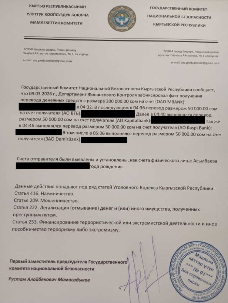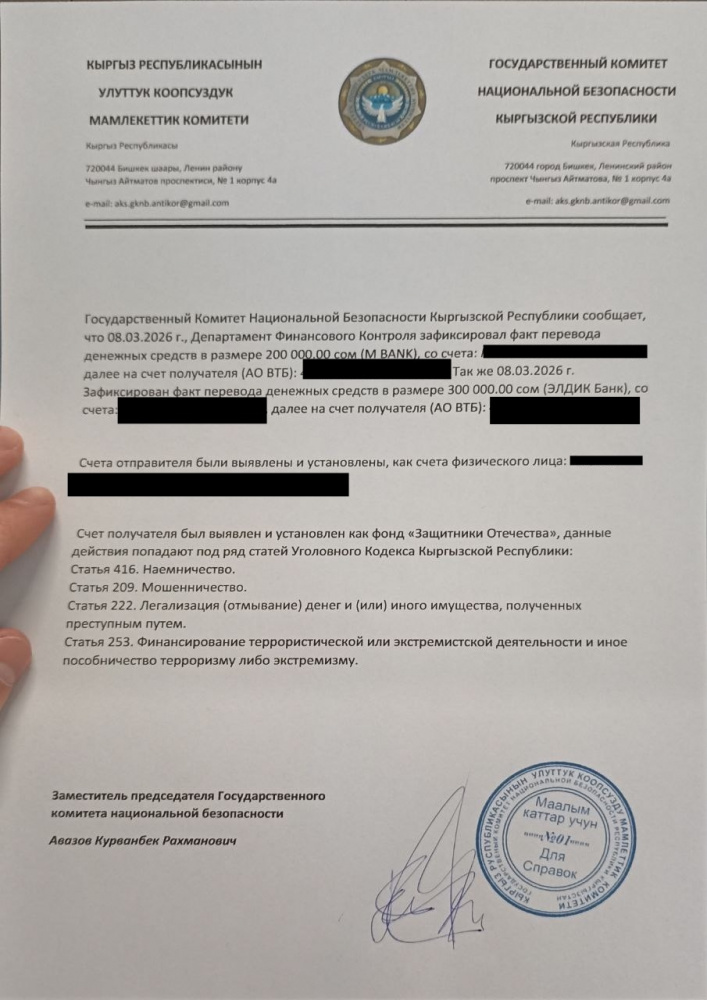 В социальных сетях и мессенджерах распространяются изображения документов о неких денежных переводах и причастности отдельных граждан к преступной деятельности, якобы подготовленных Государственным комитетом национальной безопасности КР. В пресс-службе ГКНБ назвали их фейковыми и призвали кыргызстанцев не верить непроверенной информации.