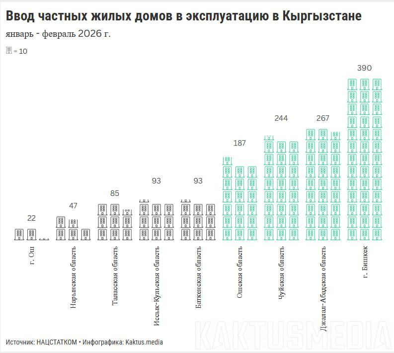 В январе - феврале 2026 года в Кыргызстане ввели в эксплуатацию 1 428 индивидуальных жилых домов общей площадью 198 тыс. квадратных метров. Это следует из данных, опубликованных Нацстаткомом.