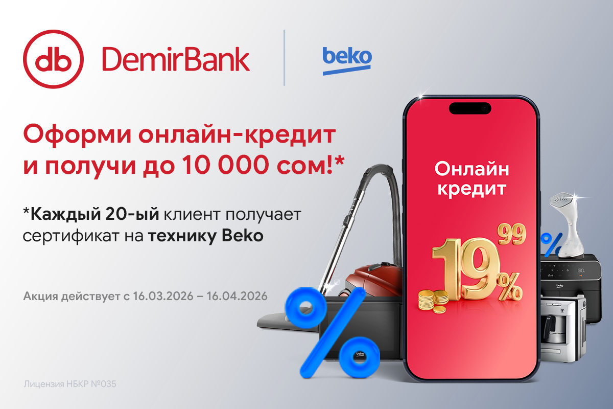 Оформите онлайн-кредит и получите сертификат на бытовую технику до 10 000 сомов от партнера банка - бренда Beko!