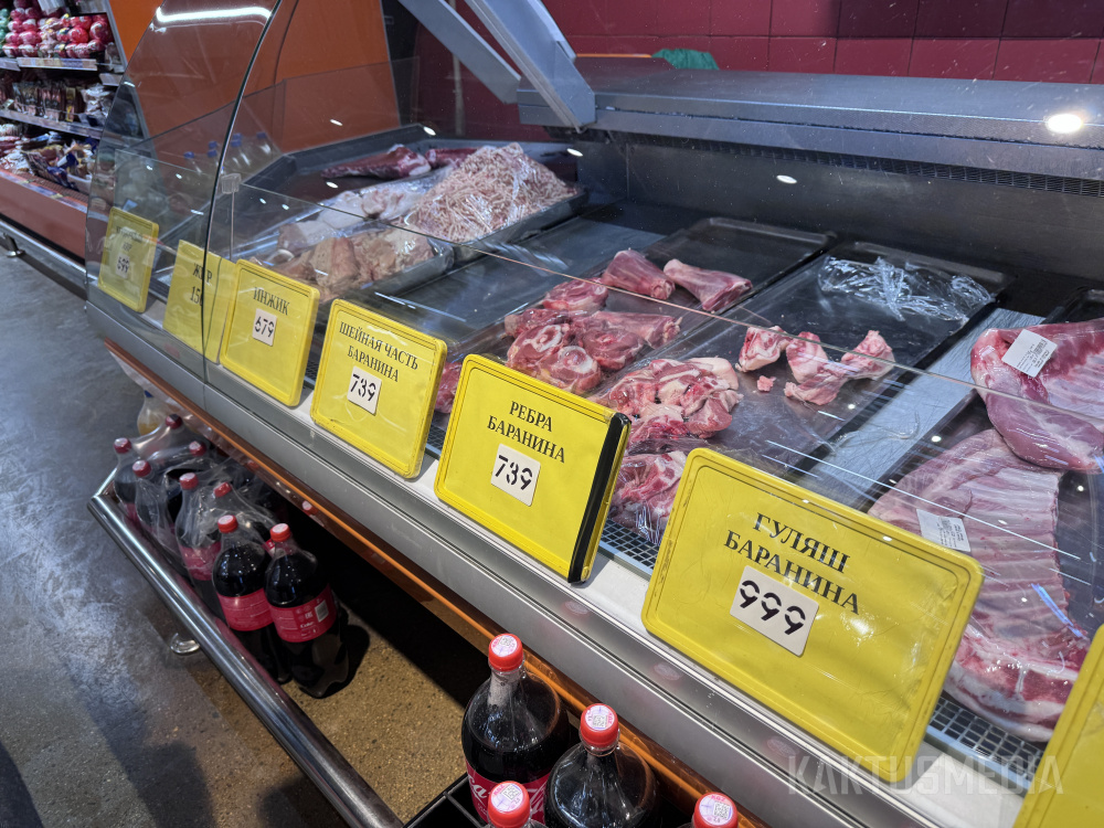 В супермаркетах мякоть баранины стоит 1 000 сомов за килограмм, позвоночная часть - 800 сомов, лопаточная - 789 сомов, ребра и шейная часть - 739 сомов. На рынках средняя цена баранины - 750 сомов.