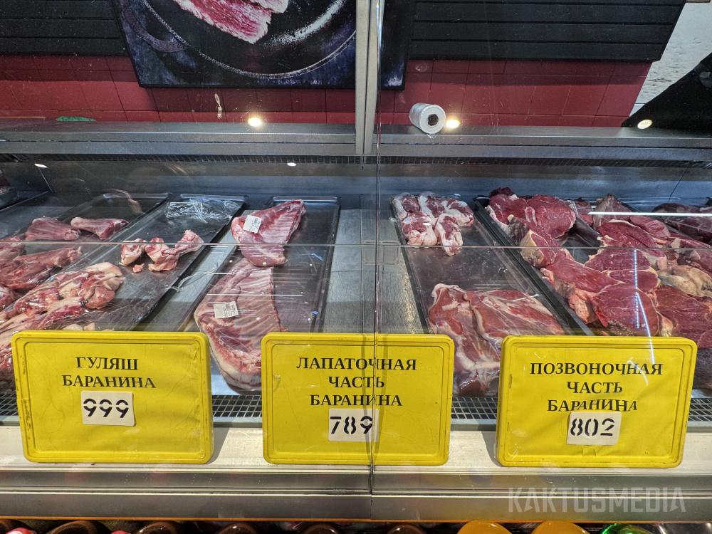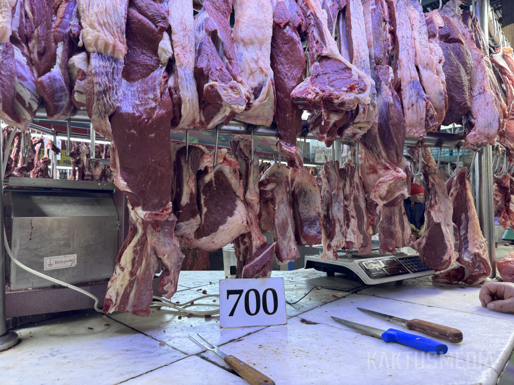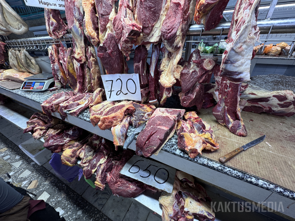 Говядина на Аламединском рынке дешевле, чем в других точках города. Но и здесь мясо на косточке стоит 650-700 сомов за килограмм, гуляш - 880 сомов, остальные части - не менее 650 сомов.