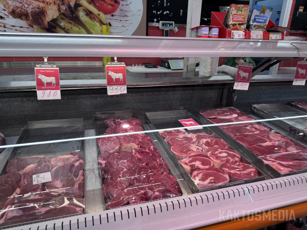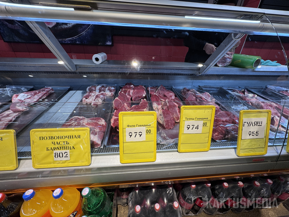 В крупных супермаркетах говядину продают дороже: гуляш - 950 сомов, филе - 979 сомов, грудинка - 749 сомов, мясо на косточке - 699 сомов.
