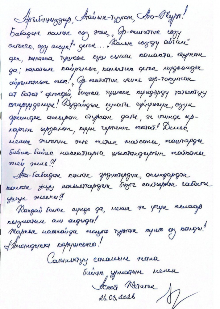Вчера, 26 марта, акын и активист Аскат Жетиген написал письмо из колонии. Текстом поделилась на своей странице в соцсетях правозащитница Гулшайыр Абдирасулова.