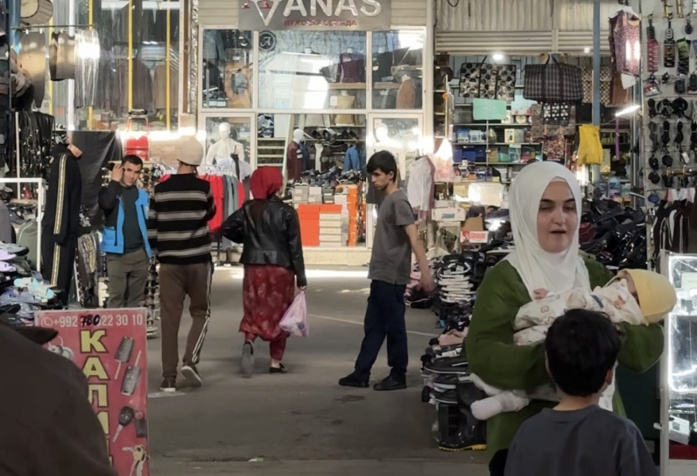 На рынке многолюдно, особенно перед закрытием в 18:00 - люди бегут по рынку, чтобы успеть купить товары. Как рассказали местные жители, этот рынок чуть дороже, чем другие, поэтому здесь можно и стоит торговаться. И действительно, нам при покупке накидки в национальном стиле сделали скидку со 160 сомони до 140 (с ≈1 464 сомов до ≈1 281) со словами: "Вам, как гостям, сделаем скидку".