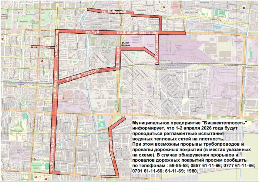 В среду и четверг - 1-2 апреля - в Бишкеке проведут регламентные испытания на плотность (опрессовка) тепловых сетей. Об этом сообщает пресс-служба мэрии Бишкека.