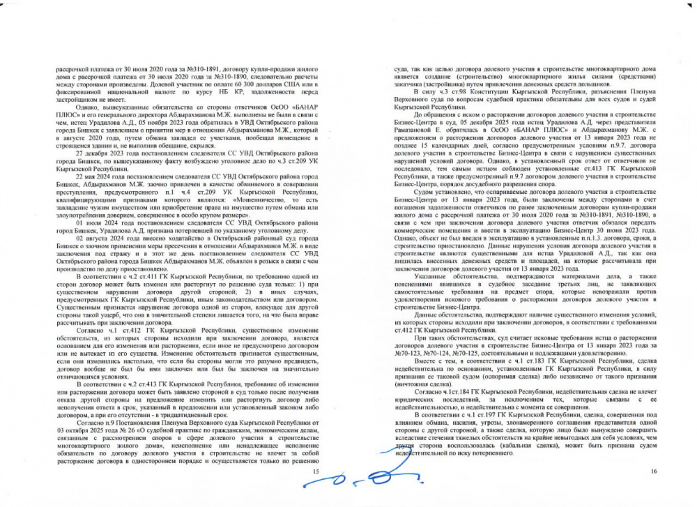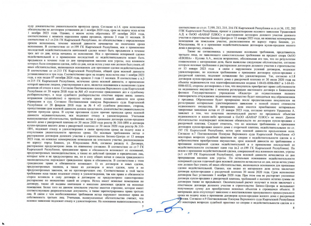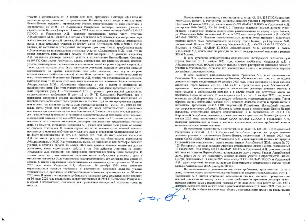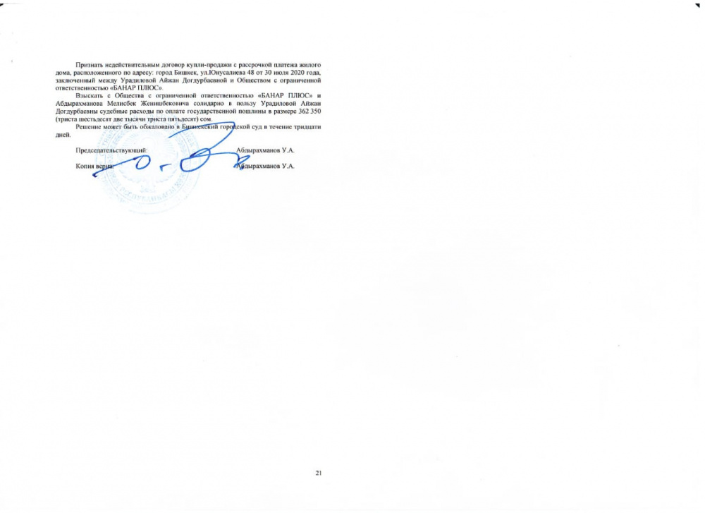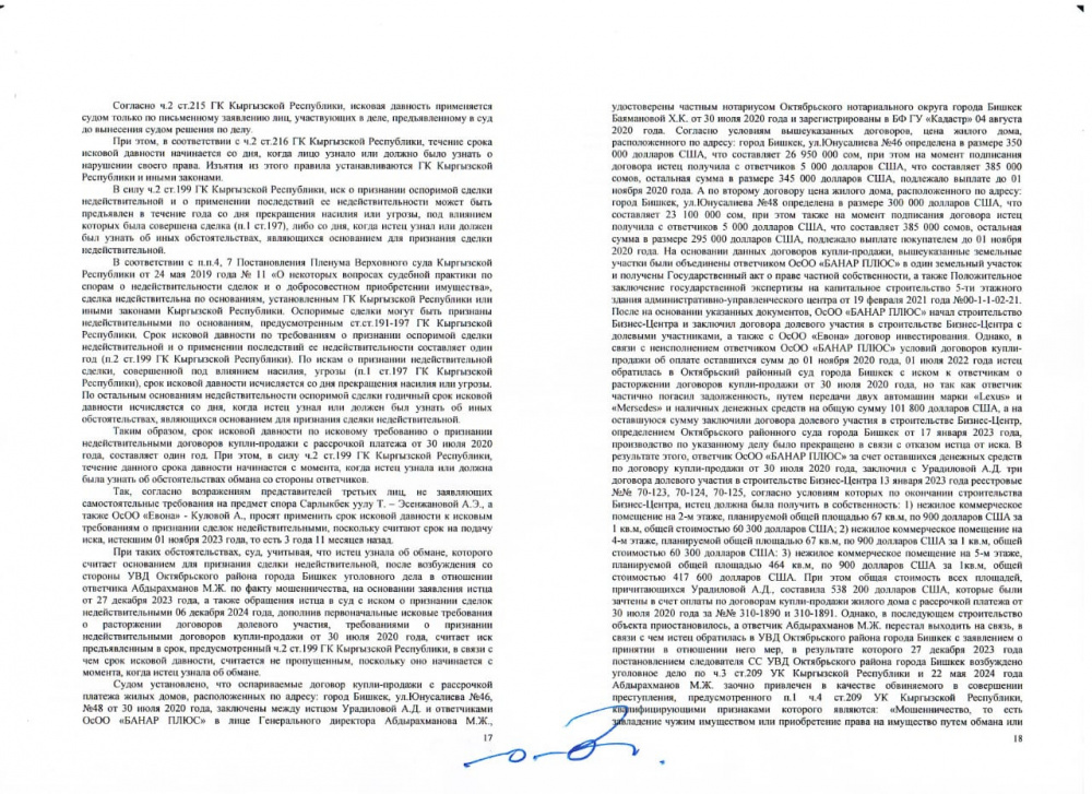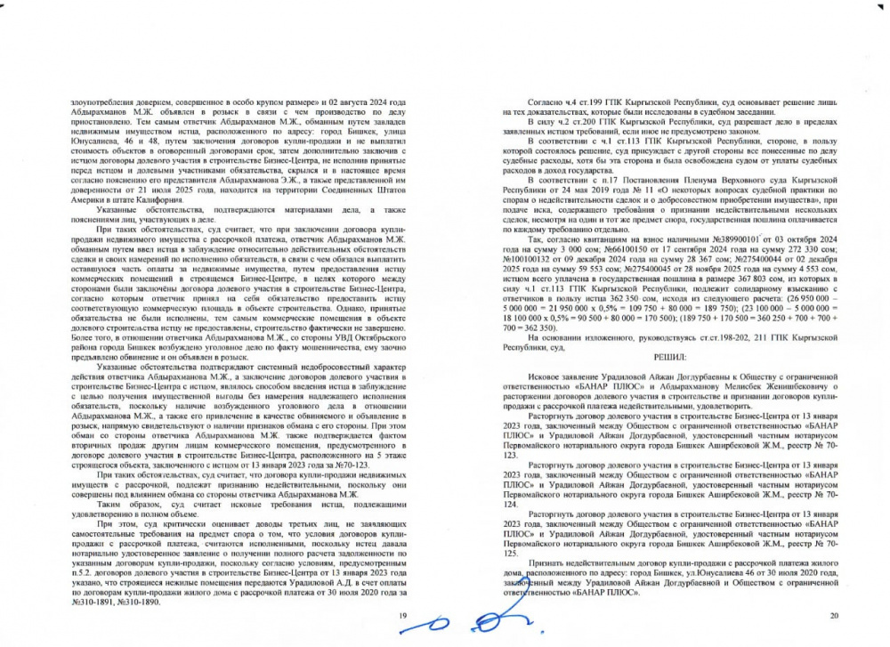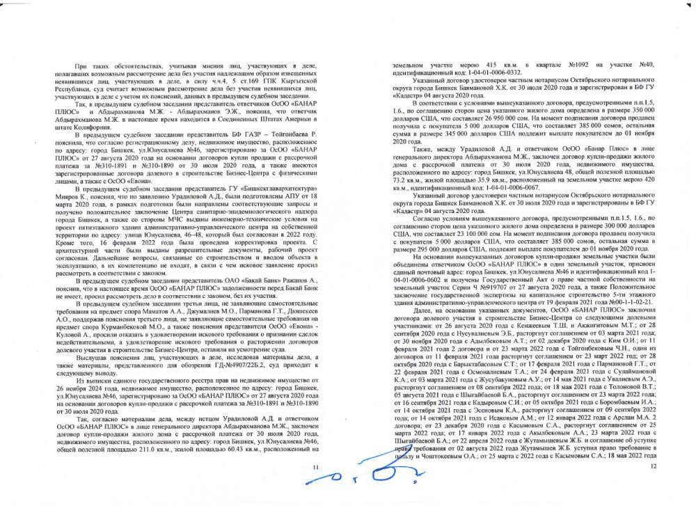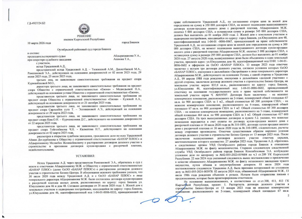Однако 10 марта 2026 года Октябрьский районный суд Бишкека решил признать недействительным договор купли-продажи с рассрочкой между Урадиловой и ОсОО "Банар Плюс".