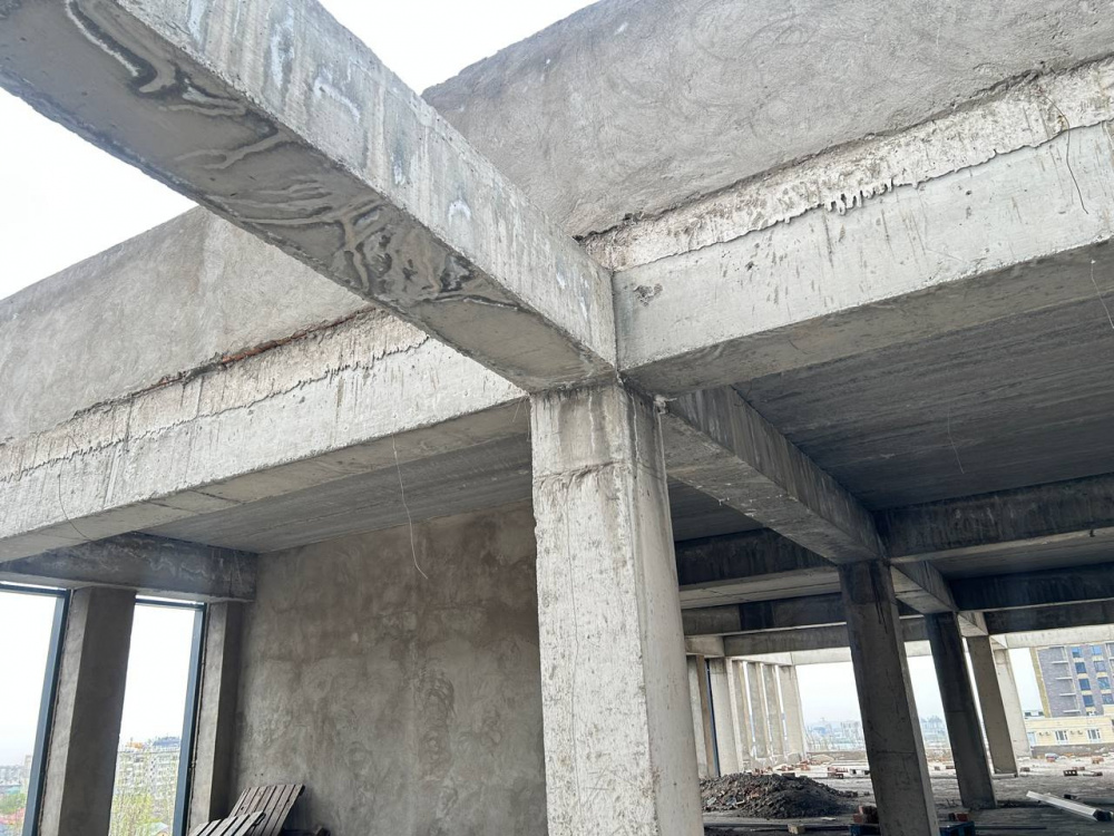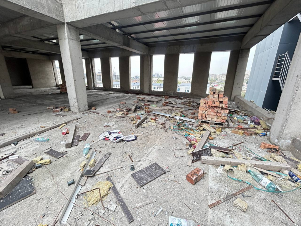 Все этажи были воздвигнуты, кое-где даже началась внутренняя отделка, утепление, устанавливали электропроводку и стеклили окна. Но крыша не перекрыта, она протекает, что является угрозой для всех опорных конструкций.