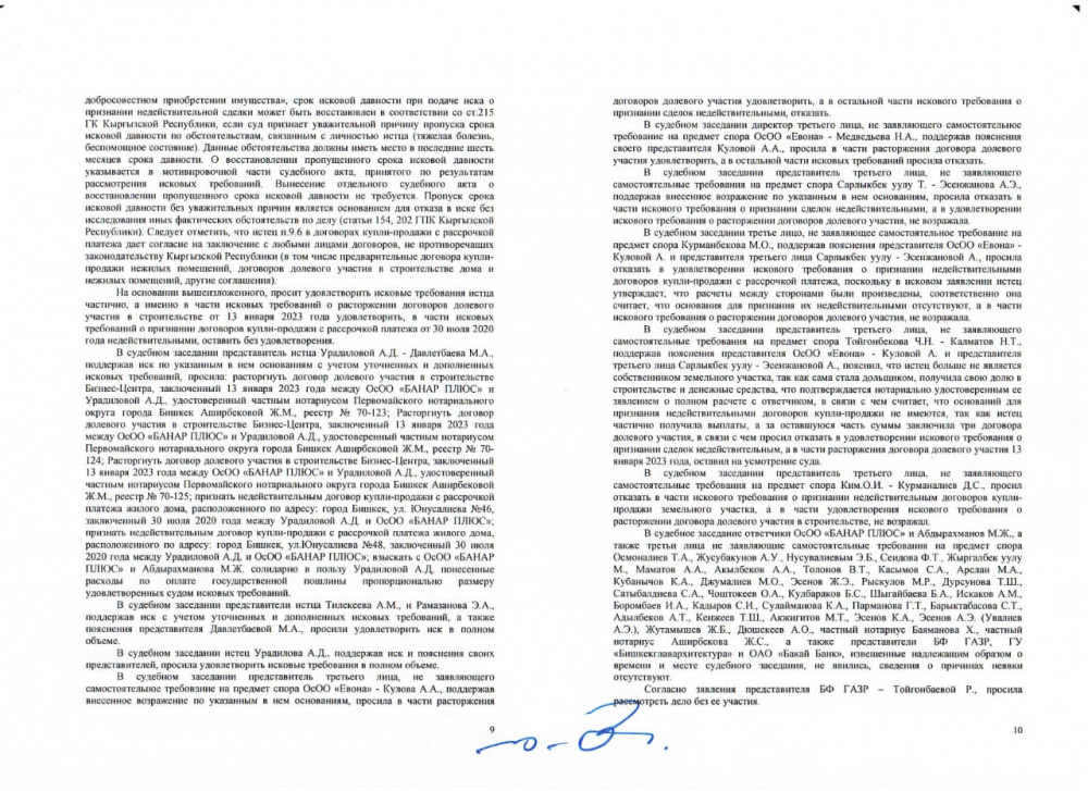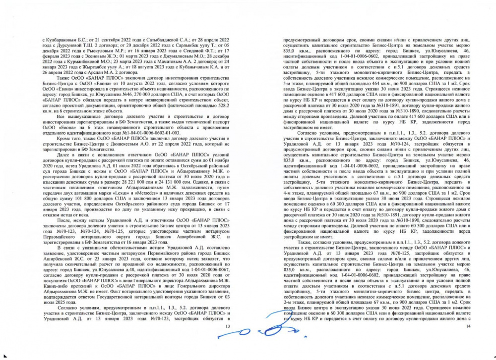 На руках у дольщиков имеются все подтверждающие документы: договоры, платежные документы. Урадилова А. ранее официально подтвердила нотариальными заявлениями получение всех денежных средств и отсутствие каких-либо претензий к ОсОО "Банар Плюс".