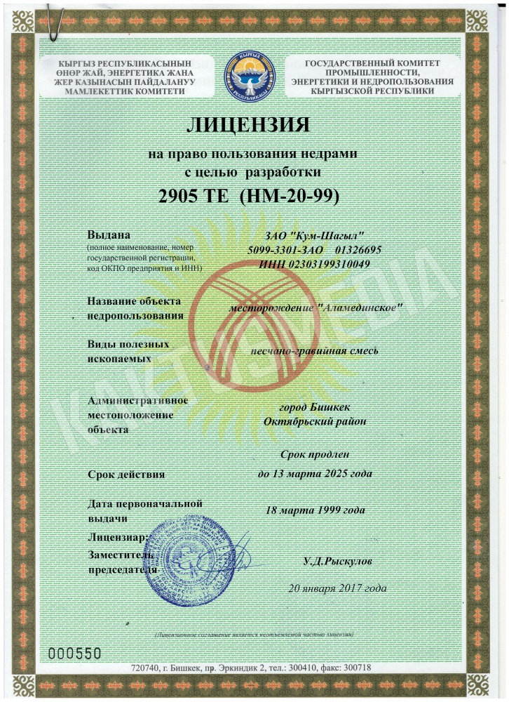 При этом сотрудники отметили, что срок лицензии на разработку карьера у ЗАО "Кум-Шагыл" закончился еще в марте 2025 года. Чтобы разрабатывать карьер без лицензии, предприятие должно быть полностью государственным. Частное предприятие должно получать лицензию. А получить новую лицензию было невозможно из-за того, что в Кыргызстане действует мораторий на выдачу новых лицензий. Тогда как в последний год разрабатывался карьер, непонятно.