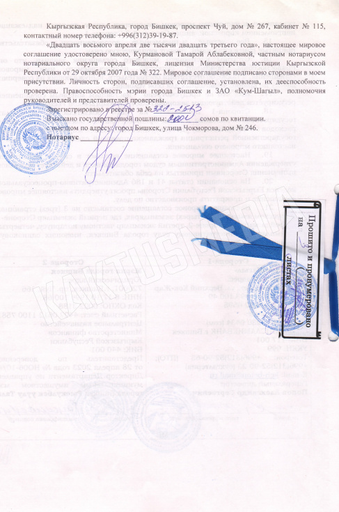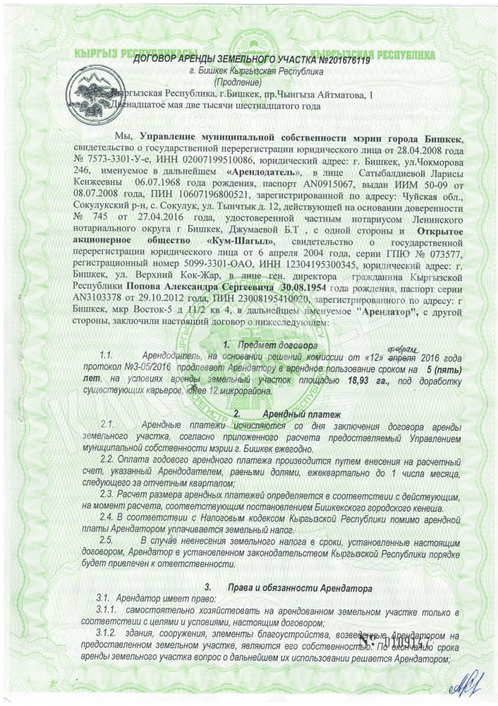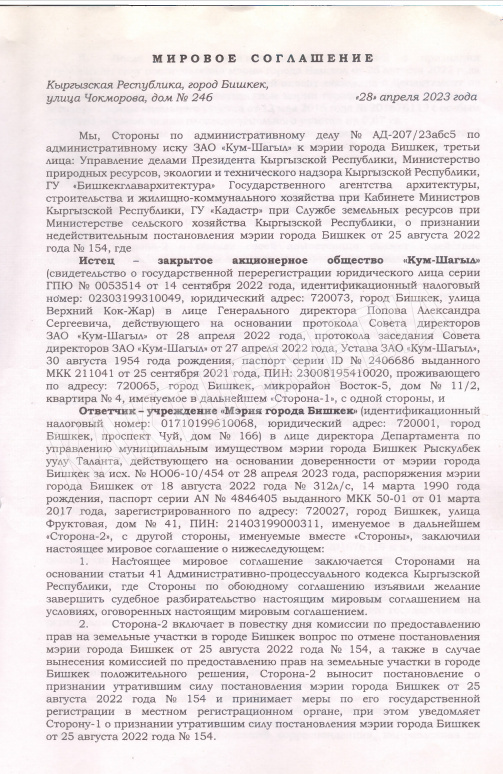 Юристы компании предоставили редакции Kaktus.media мировое соглашение между ЗАО "Кум-Шагыл" и мэрией Бишкека, в котором решается вопрос об аренде карьера. То есть никакой речи о приватизации карьера никогда не велось.