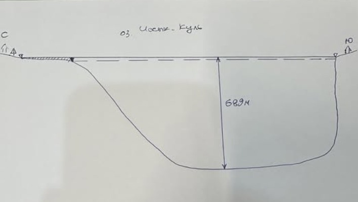 На своей странице в социальных сетях он сопроводил свои доводы схематическим рисунком строения дна Иссык-Куля. Горизонтальная линия – поверхность озера. На севере (слева) - район Чолпон-Аты, на юге (справа) - район села Каджы-Сай. Нижняя кривая линия – дно озера.