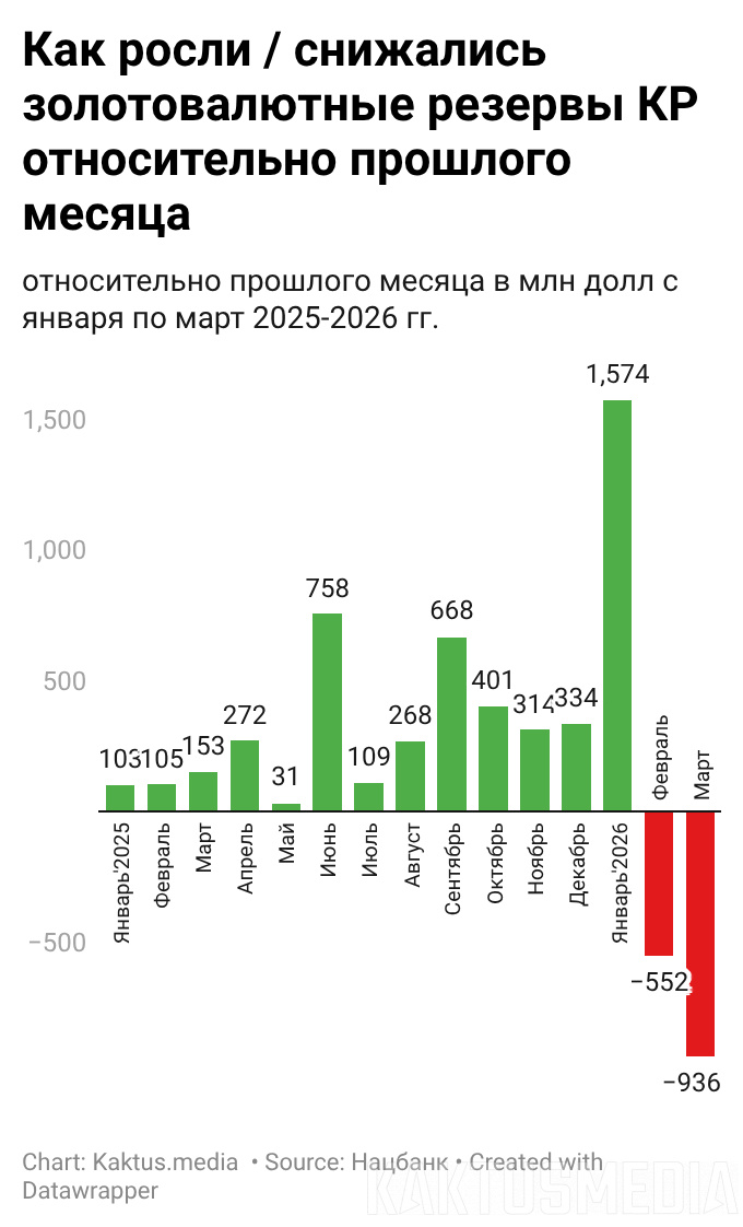 С помощью золотовалютных резервов Нацбанк в основном стабилизирует курс сома за счет проведения валютных интервенций, как отмечали в самом регуляторе. Подробнее прочитать о том, из чего состоят золотовалютные резервы Кыргызстана и сколько в них золота, можно здесь.