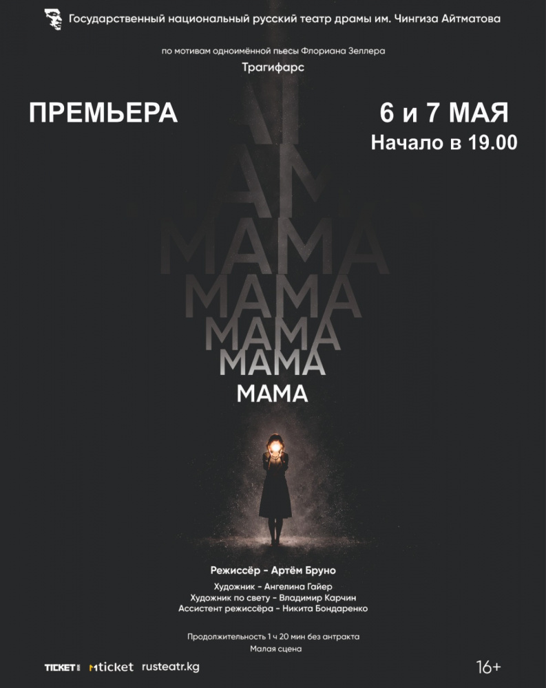 Русский театр драмы имени Чингиза Айтматова приглашает на премьеру спектакля "Мама" по мотивам пьесы одного из самых востребованных драматургов современности - Флориана Зеллера, лауреата престижных премий "Оскар" и "Тони". 6 и 7 мая - только два дня!