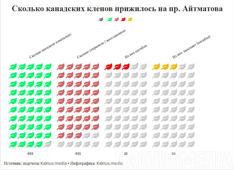 Местные власти отчитывались о планах по замене неприжившихся деревьев, но точной информации о проведенной в этом направлении работе все еще нет. Однако, как подсчитали журналисты Kaktus.media, по состоянию на 11 апреля часть деревьев вырубили: здесь осталось 461 растение, из которых около 30 уже выглядят засохшими.