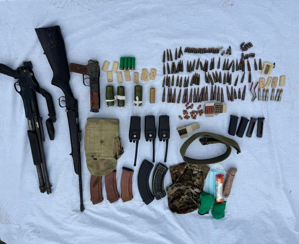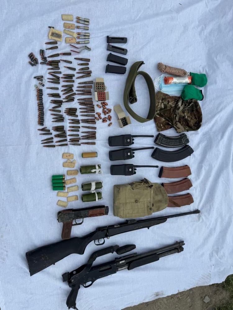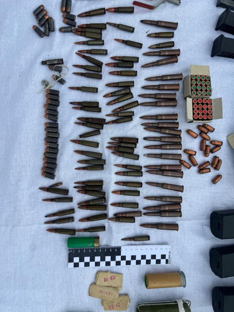 В схроне обнаружены две единицы огнестрельного оружия неустановленного образца, одно самодельное оружие, три гранаты неустановленного типа, 177 гильз и патронов различного калибра, девять магазинов для разных видов оружия, три радиостанции Motorola, а также другие предметы и специальные средства.