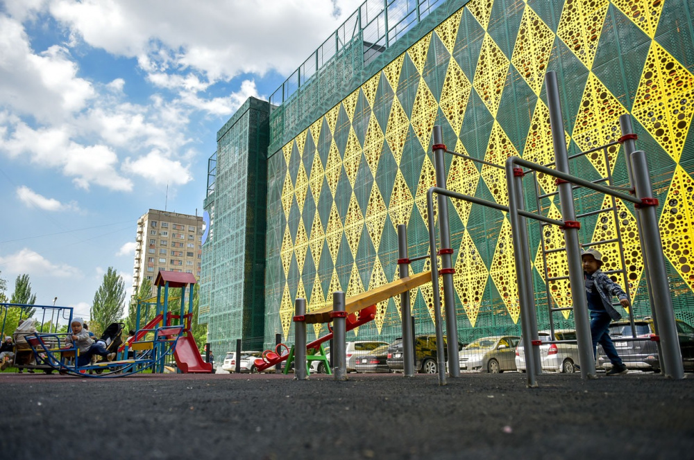 Особенностью проекта стала эксплуатируемая кровля: на крыше здания разместили спортивную зону с тремя теннисными кортами с травмобезопасным покрытием. В мэрии отметили, что это одно из первых подобных решений, реализованных в Кыргызстане.