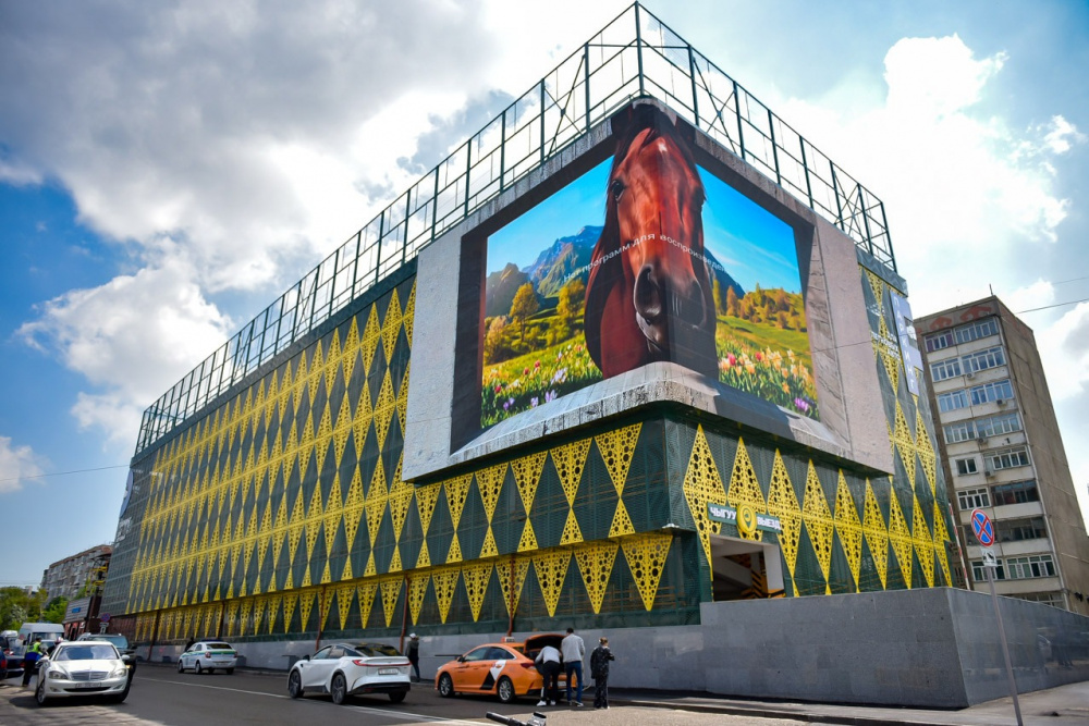 Фасад здания выполнен с применением современных перфорированных металлических панелей. Также на нем установлен светодиодный экран.