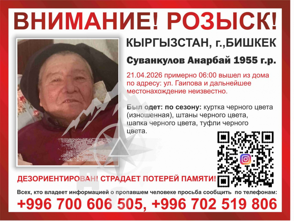 Всех, кто владеет информацией о пропавшем, просьба сообщить по телефонам: +996 555 23 04 90, +996 755 07 47 20.